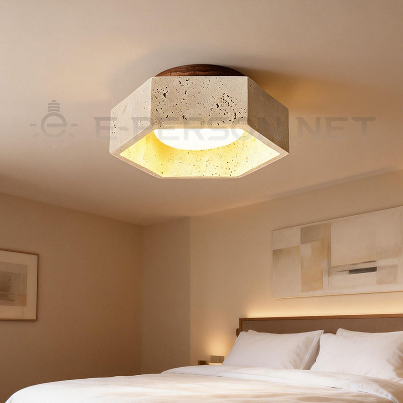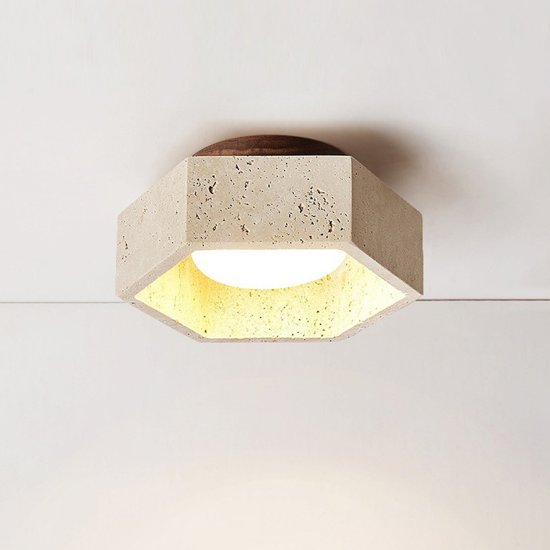 This indoor ceiling light features a geometric stone body made from natural travertine, creating a clean and decorative flush mount lighting solution.The stone surface adds texture and material depth, while the downward light provides soft ambient illumination rather than harsh direct brightness.