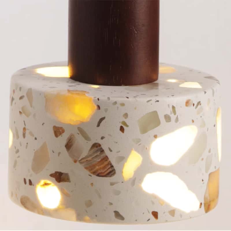 This minimalist wall pendant lamp features a translucent terrazzo cylinder shade, paired with solid wood and matte black iron, creating a modern yet warm lighting effect.
