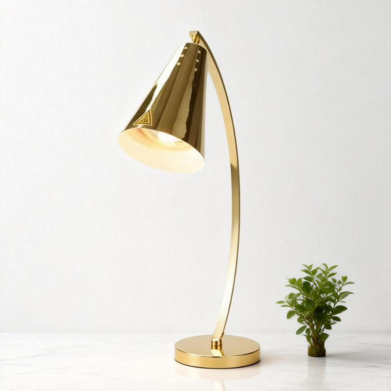 This modern table lamp features a sleek curved metal arm and a refined cone-shaped lampshade, creating a perfect balance between elegance and functionality.The polished brass finish adds a luxurious touch, making it ideal for upscale bedrooms, hotel bedside tables, living rooms, or reading corners.- Suitable place : Interior House