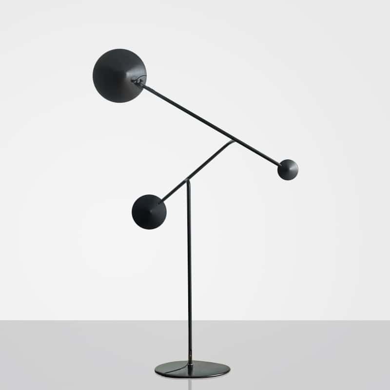 Add a bold statement to your interior with this uniquely designed geometric double-arm floor lamp. Inspired by modern sculpture and minimalist architecture, this floor lamp features two spherical light heads suspended on slim iron arms in perfect balance.