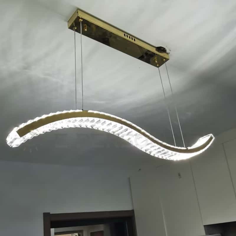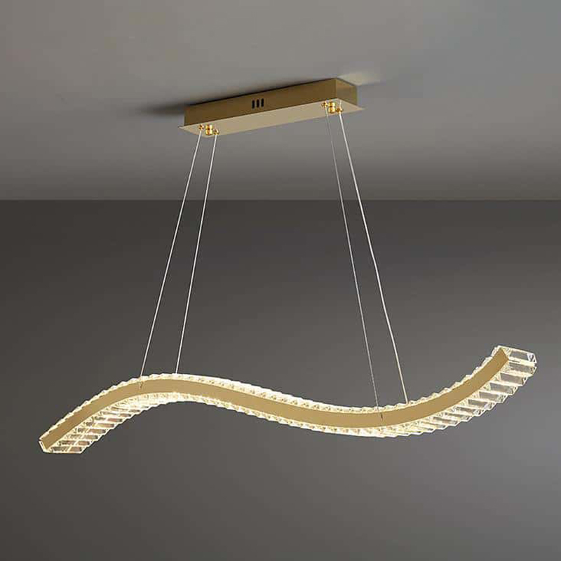This modern luxury crystal LED pendant light features a distinctive golden wave-shaped frame combined with precision-cut crystal pieces, delivering brilliant light reflection and a premium decorative effect. The elegant S-curve design brings a sense of movement and sophistication, making it ideal for dining rooms, living rooms, villas, hotels, and high-end commercial spaces. Equipped with energy-efficient integrated LED chips and adjustable suspension cables, it ensures both visual comfort and installation flexibility. A perfect choice for buyers seeking upscale, modern, and uniquely designed lighting fixtures.