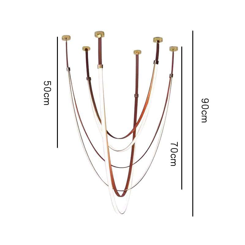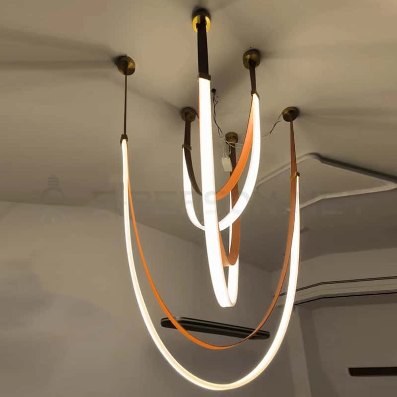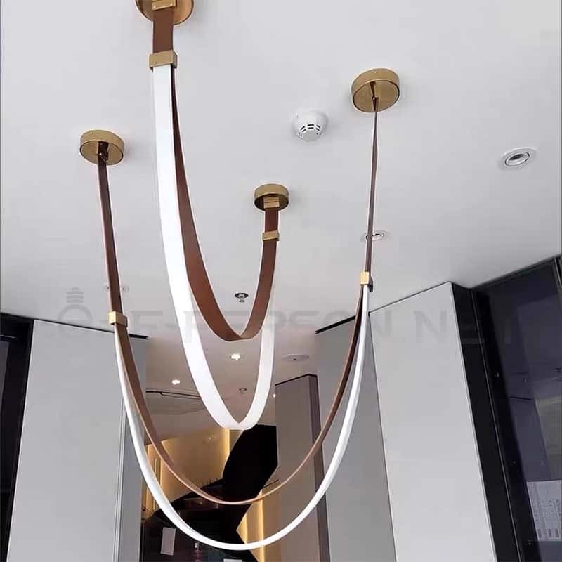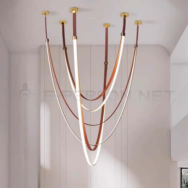 This multi-point pendant light features a flexible, soft-curved hanging structure that forms an elegant draped silhouette, creating a striking focal point in luxury interiors. The lamp body is wrapped with refined leather or fabric-texture material, paired with multiple brass-finished ceiling mounts for a visually balanced and customizable installation. Its artistic flowing lines offer gentle, ambient illumination suitable for living rooms, hotel lobbies, villas, showrooms, and high-end commercial spaces. With adjustable suspension heights and premium materials, this pendant light provides a modern sculptural aesthetic that elevates any contemporary decor.