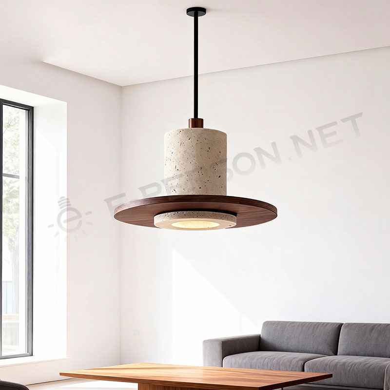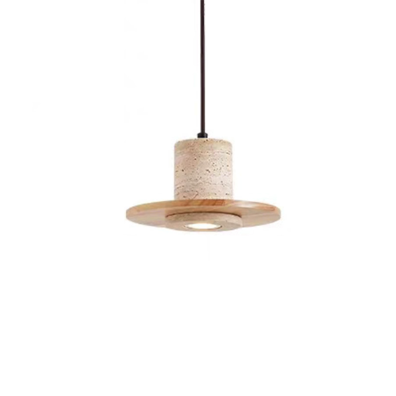 This modern pendant light combines natural travertine-style stone with a warm walnut-textured wood disc, creating a clean and stylish minimalist design. The cylindrical stone body adds a refined tactile feel, while the wide wood disc shade provides balanced visual structure and soft downward illumination.