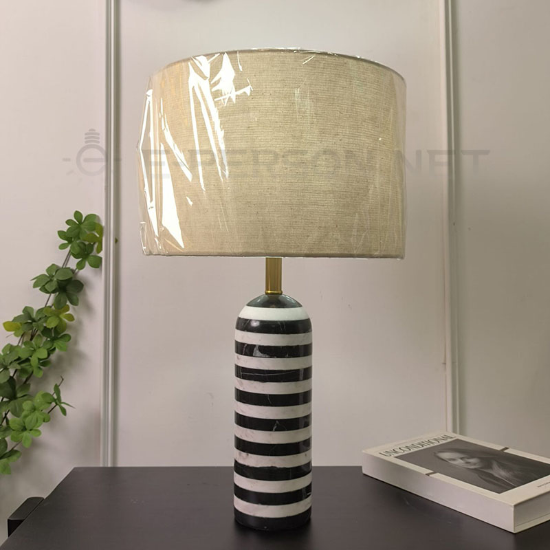 This modern marble table lamp features a bold black and white striped base, creating a strong visual contrast and artistic presence. Combined with a soft fabric lampshade, it delivers warm, comfortable lighting while serving as a decorative statement piece.- Suitable place : Interior House