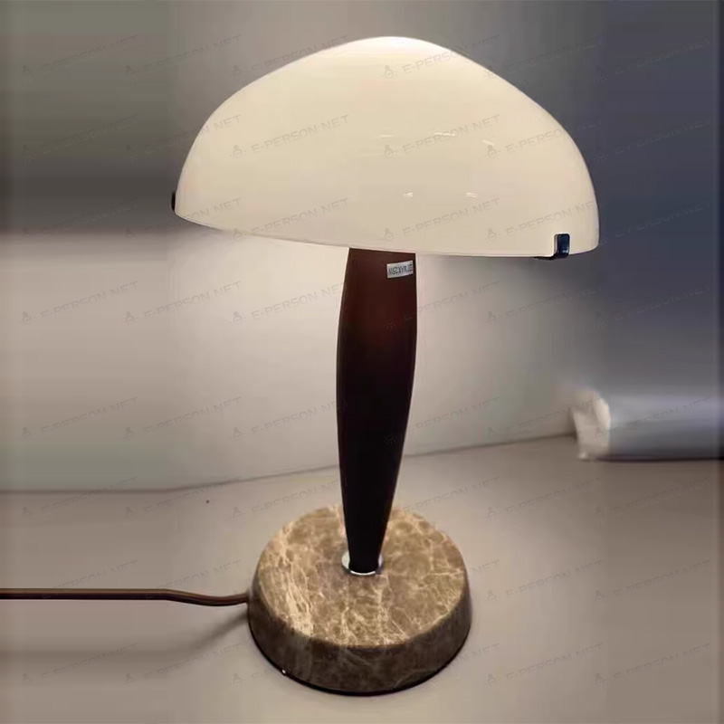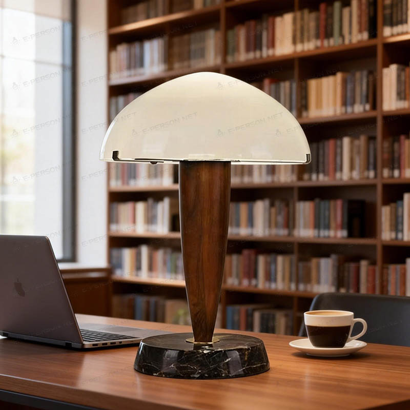 This mid-century modern table lamp features a classic mushroom silhouette, combining a smooth glass dome shade with a refined wooden stem and a solid stone base.The balanced proportions and warm materials create a timeless design that complements both modern and vintage interiors.- Suitable place : Interior House
