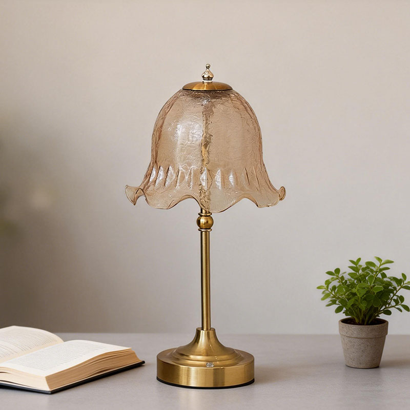 This vintage table lamp features a classic brass finish metal base paired with a delicate flower-shaped glass shade, creating a warm and elegant lighting effect.The softly textured glass diffuses light evenly, providing comfortable ambient illumination for bedrooms, living rooms, and bedside areas.- Suitable place : Interior House