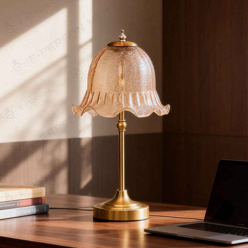 This vintage table lamp features a classic brass finish metal base paired with a delicate flower-shaped glass shade, creating a warm and elegant lighting effect.The softly textured glass diffuses light evenly, providing comfortable ambient illumination for bedrooms, living rooms, and bedside areas.