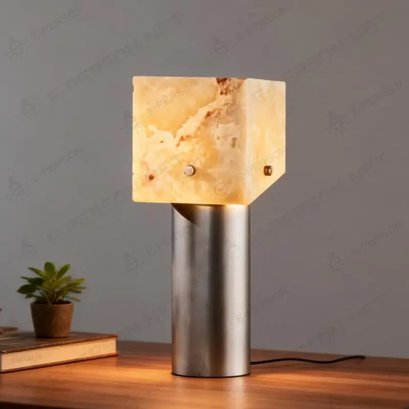 This minimalist table lamp is crafted with a natural stone cube shade paired with a sleek metal base, offering a balanced and contemporary design.