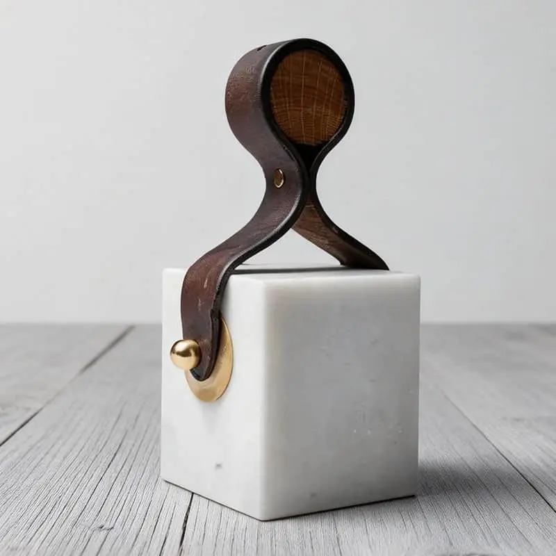 This modern table lamp is crafted from solid natural alabaster and accented with a refined leather handle, creating a distinctive balance between stone, metal, and soft material detail.