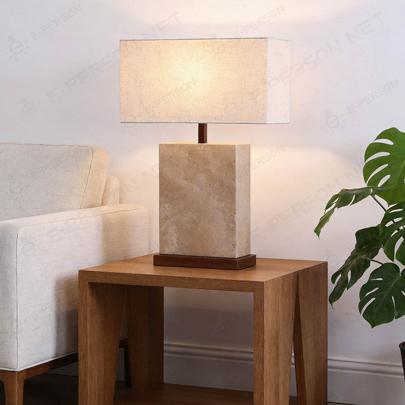 Travertine Table Lamp Square Stone Base Modern Bedside Decorative Lighting