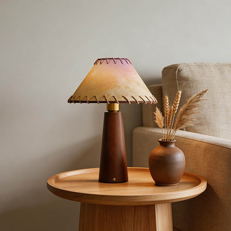 This table lamp features a distinctive paper-wrapped lampshade with handcrafted stitching details, creating a unique and premium look. Paired with a wood base, it delivers warm and comfortable lighting.