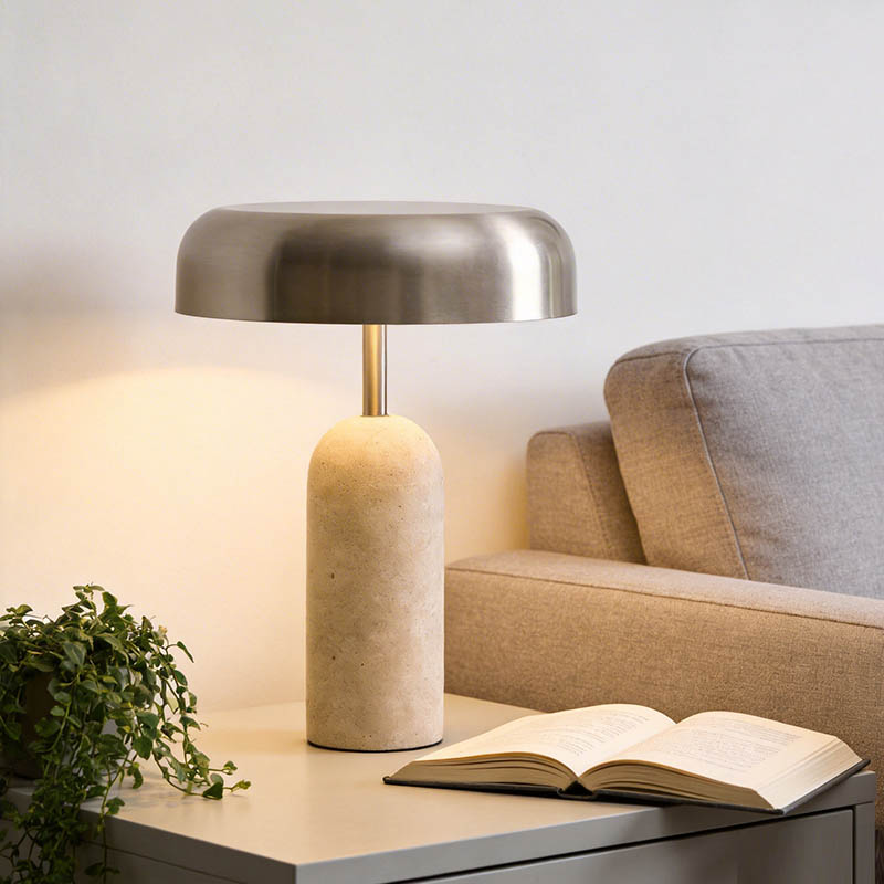 This modern table lamp combines a solid stone base with a sleek metal lampshade, delivering a clean and contemporary aesthetic. The contrast between natural material and metallic finish enhances its premium appearance.