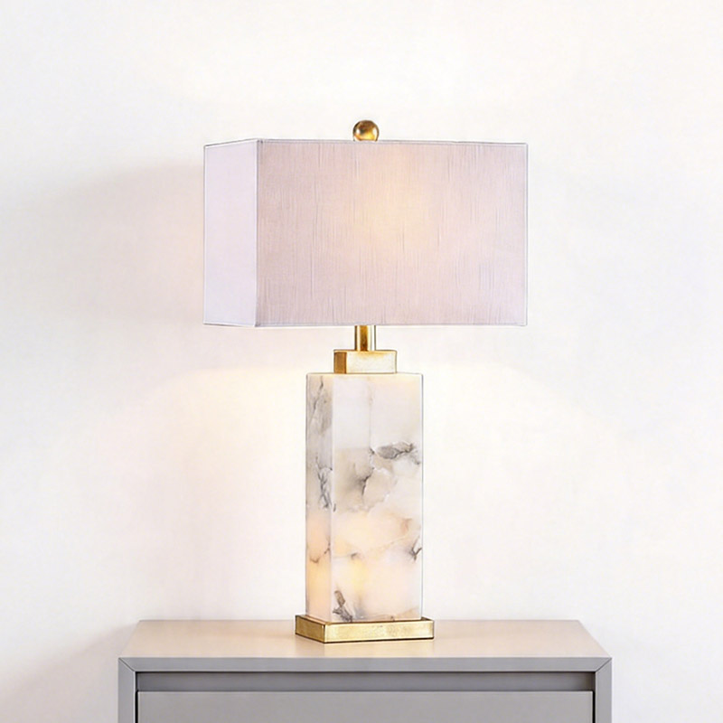 Luxury Alabaster Table Lamp Square Base Brass Fabric Shade Bedside Lighting