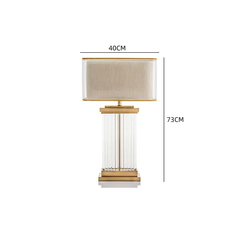 This elegant table lamp embodies a refined Art Deco aesthetic, combining modern geometry with timeless luxury. The lamp base features vertically aligned crystal rods supported by a brushed gold metal frame, creating a shimmering effect when illuminated. Its soft fabric lampshade diffuses light beautifully, casting a warm and inviting glow suitable for bedrooms, living rooms, or upscale hotel interiors. With a sophisticated gold finish and precision craftsmanship, this piece seamlessly blends functionality and art, making it a perfect statement accessory for contemporary and luxury interiors.