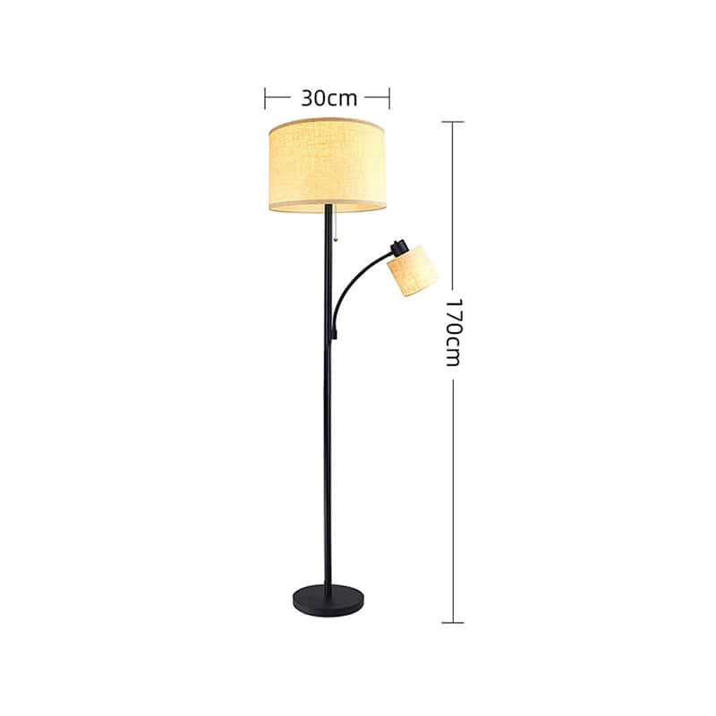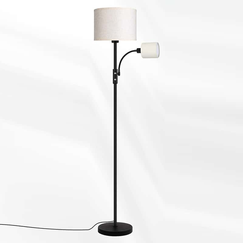 This modern dual-head floor lamp combines soft ambient lighting with a practical reading light, making it an ideal choice for living rooms, bedrooms, offices and reading corners. The main lamp features a warm linen fabric shade that creates a cozy atmosphere, while the side lamp is equipped with an adjustable curved arm for focused task lighting. Crafted with a stable metal base and durable lamp body, this 2-in-1 standing lamp offers both functionality and style. Compatible with standard E27 bulbs, easy to assemble, and designed to fit various interior styles such as modern, minimalist, Scandinavian and contemporary homes.