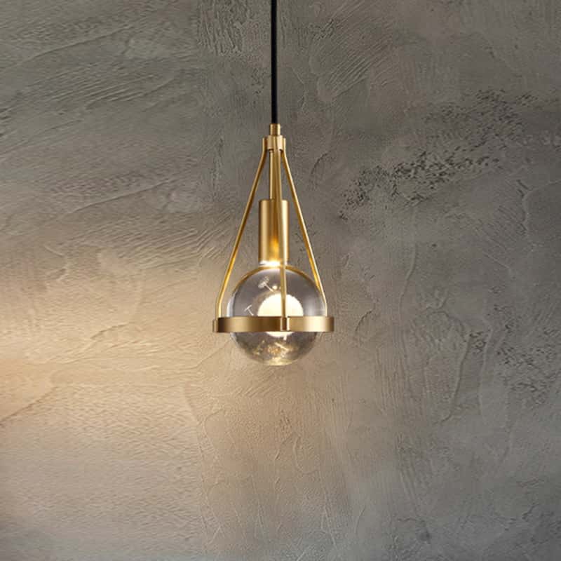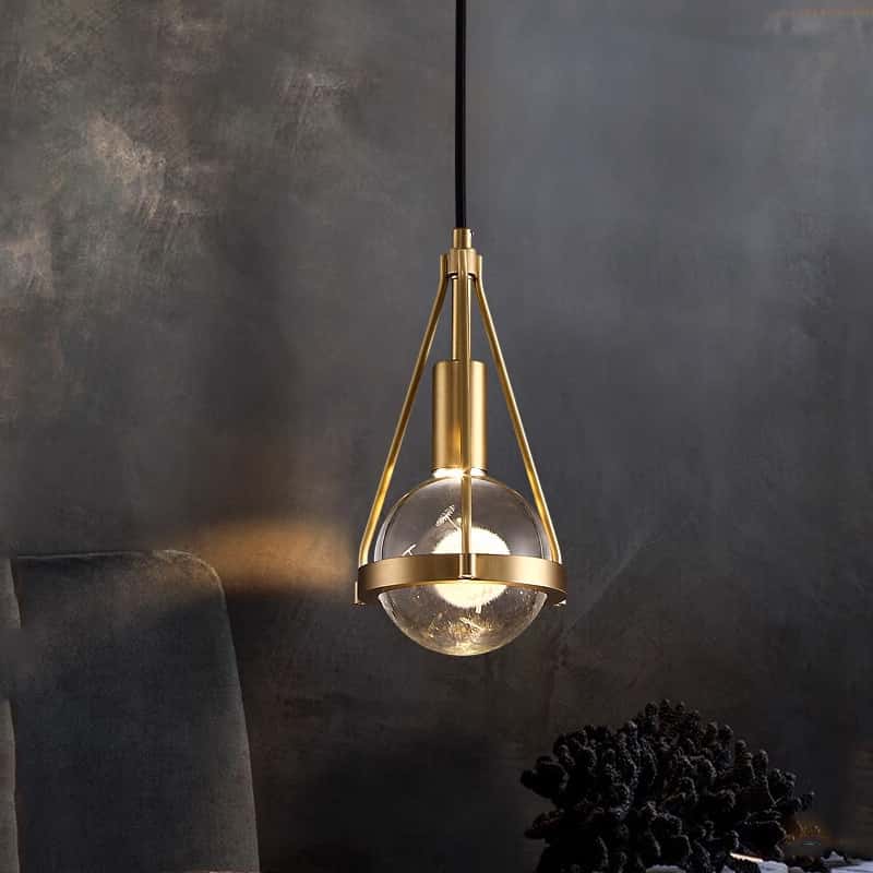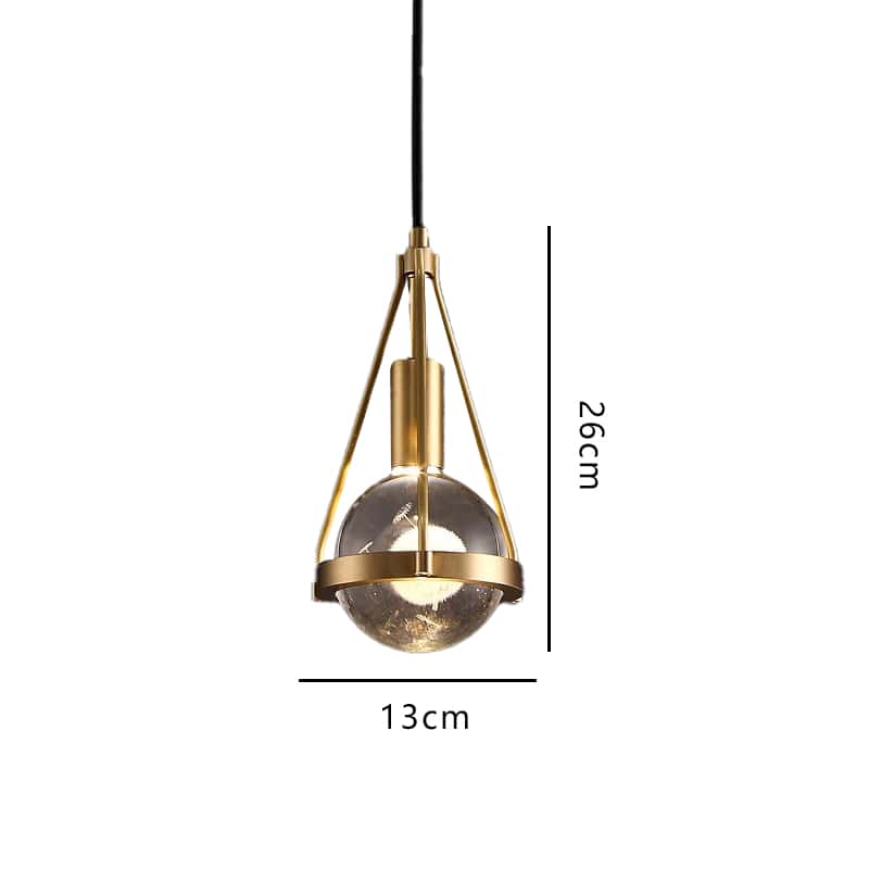 This premium pendant light features a striking combination of gold-finished metal and a spherical glass shade, designed to deliver both elegance and modern sophistication. Its unique triangular support frame enhances structural stability while creating an eye-catching architectural look. The soft glowing glass sphere diffuses light evenly, making it perfect for creating a warm and inviting atmosphere. Ideal for dining rooms, kitchen islands, bars, cafés, restaurants, and modern luxury interiors. With durable metal craftsmanship and high-transparency glass, this hanging lamp blends decorative beauty with long-lasting quality. Compatible with LED bulbs and suitable for various ceiling heights.