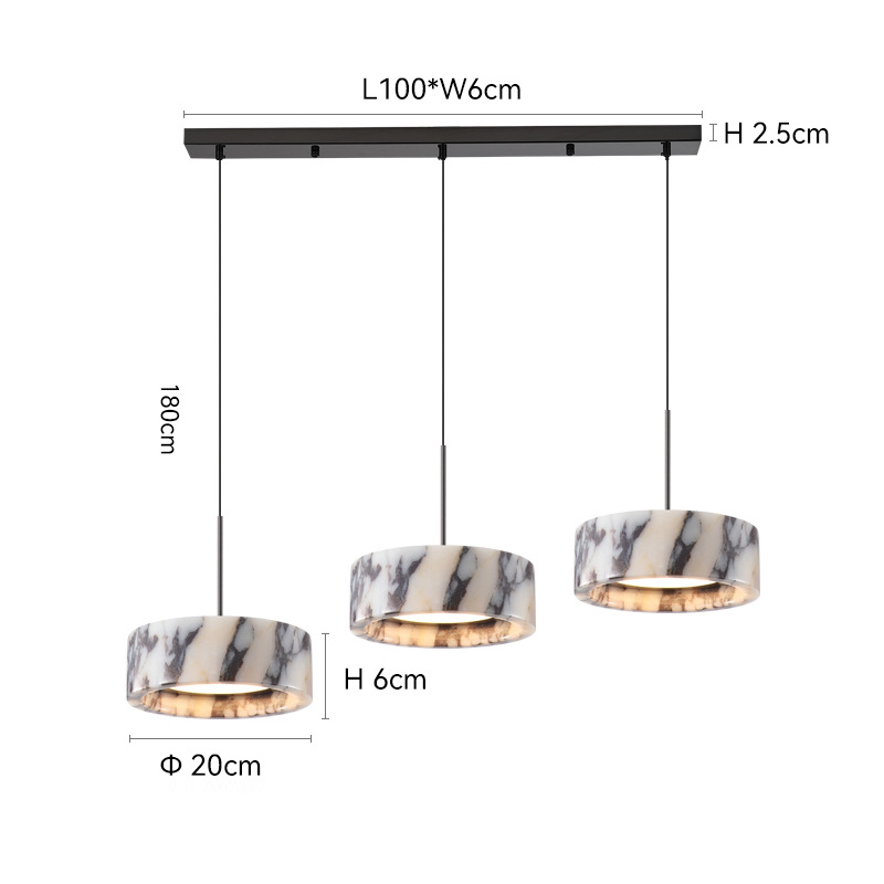 This modern 3-head pendant light features natural marble lampshades paired with a sleek linear metal suspension bar, creating a luxurious and contemporary look ideal for premium interior spaces. Each lampshade is crafted from real marble stone, delivering unique patterns and high-end texture while offering soft, warm illumination. The balanced 3-light design provides excellent coverage for kitchen islands, dining tables, bars and modern living areas. With stable metal hardware, adjustable suspension height, and LED bulb compatibility, this pendant lamp combines durability, aesthetics and functionality—perfect for customers seeking premium decorative lighting for residential or commercial use.