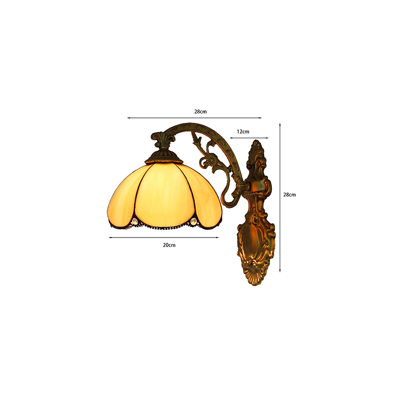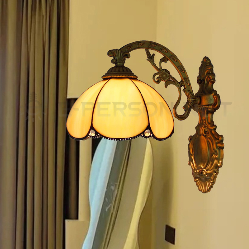 This vintage Tiffany-style wall lamp features a handcrafted stained glass shade paired with an intricately detailed antique bronze arm, bringing a warm, artistic glow to any interior space. The petal-shaped glass lampshade diffuses light softly, creating a cozy and nostalgic ambiance. The ornate metal arm and wall plate add classical elegance, making it a perfect choice for bedrooms, hallways, living rooms, cafés, restaurants and boutique hotels. With durable craftsmanship and timeless vintage aesthetics, this wall sconce is ideal for customers seeking decorative art lighting that enhances both atmosphere and interior style. Compatible with standard E26/E27 bulbs and easy to install.