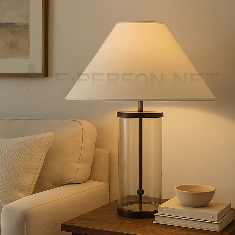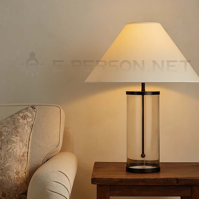 This modern table lamp features a clear glass cylinder base paired with an oversized tapered fabric shade, creating a clean and elegant silhouette that enhances any interior space. The transparent glass base adds a light and airy aesthetic, while the large cone shade diffuses light evenly to produce a warm and cozy ambiance. The internal metal rod adds structure and a refined decorative touch.