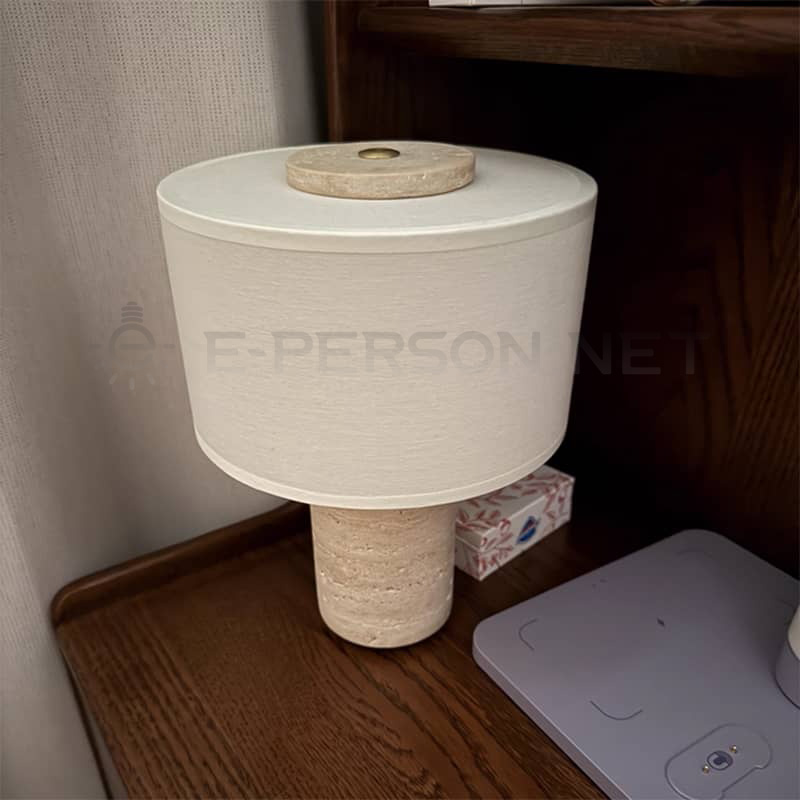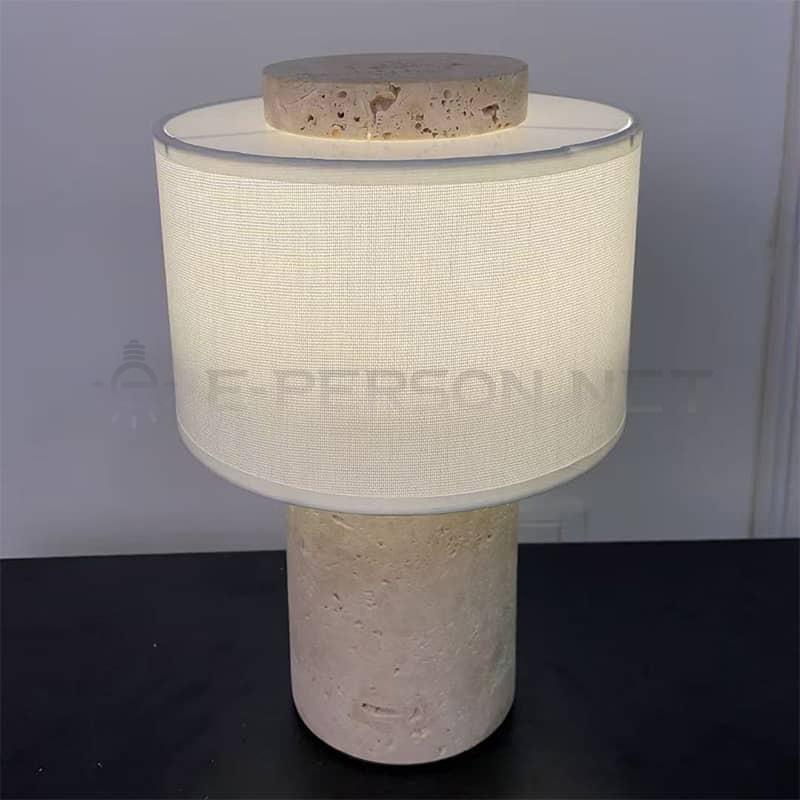 The cylindrical travertine base offers excellent stability and a warm natural stone texture, while the fabric shade gently diffuses light to create a comfortable ambient atmosphere.