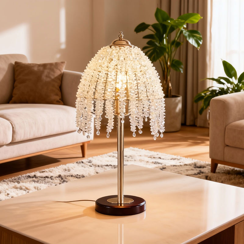 This luxury crystal table lamp features an elegant cascading crystal fringe design, creating a refined and glamorous visual effect when illuminated.