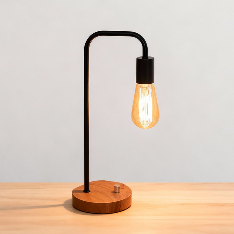 This modern industrial table lamp features a clean metal frame combined with a solid wooden base, creating a perfect balance between minimalist design and natural warmth.