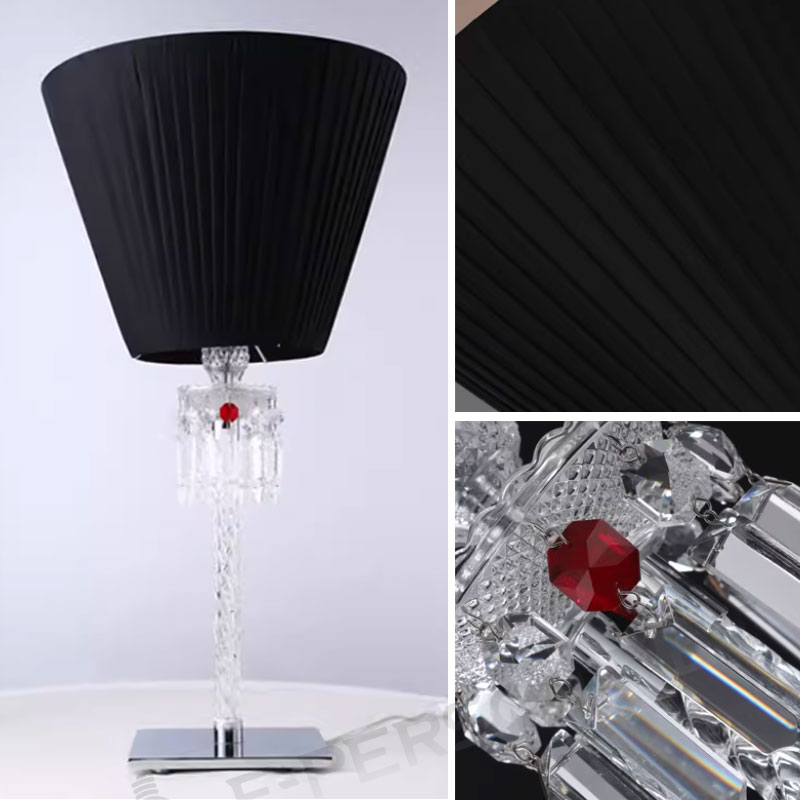 This luxury table lamp features a black fabric lampshade combined with a refined metal structure and crystal decorative elements, creating an elegant and sophisticated visual appeal.