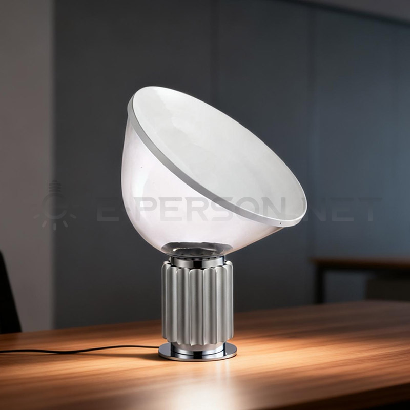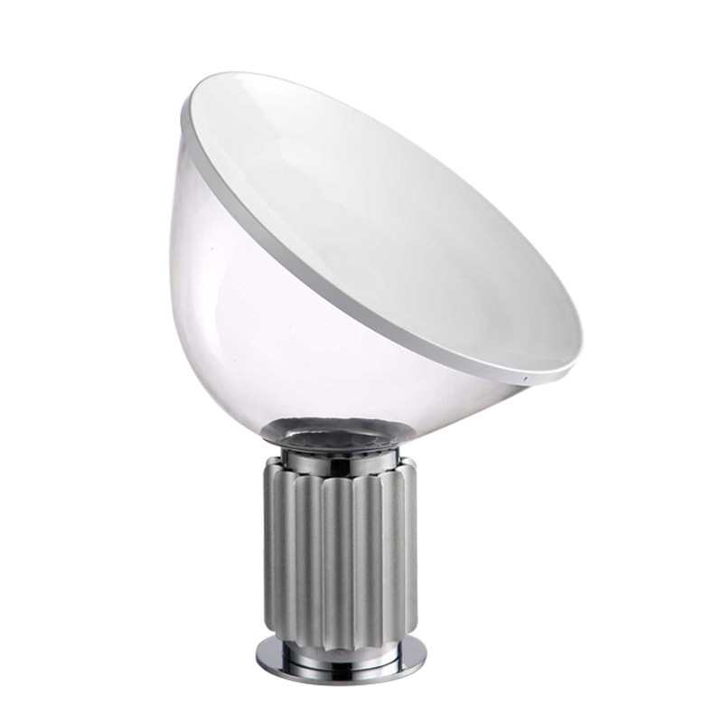 This modern designer table lamp features a sculptural glass lampshade with adjustable tilting angle, allowing flexible light direction while creating a strong artistic visual impact.