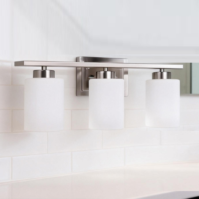 This modern 3-light wall vanity light features a brushed nickel metal finish paired with frosted glass shades, offering a clean and elegant lighting solution for contemporary interiors.
