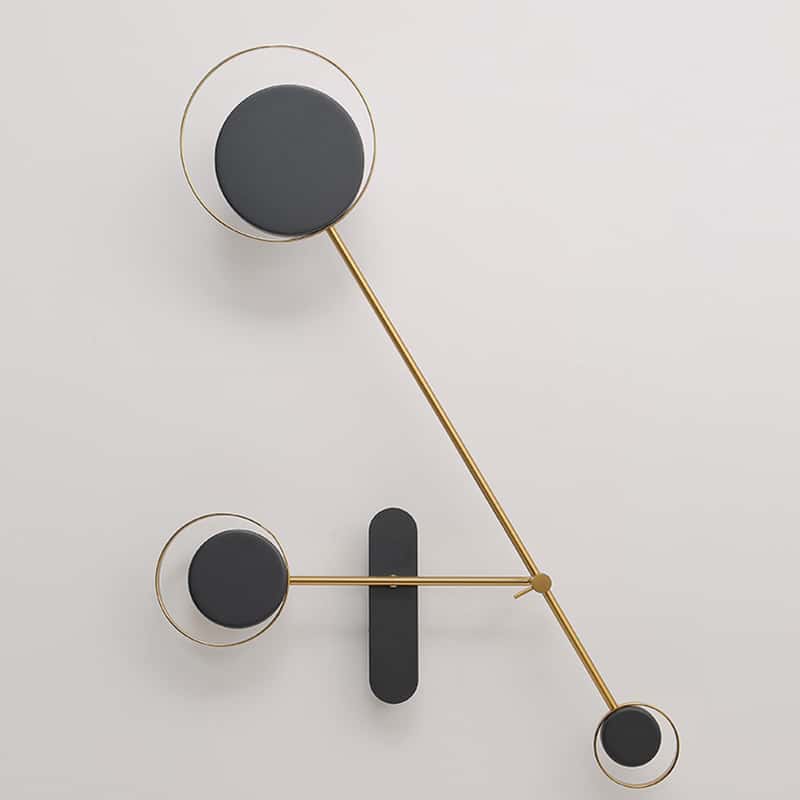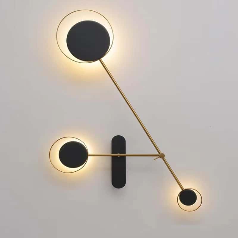 This modern geometric LED wall lamp features a striking black and gold linear structure with three circular accents connected by elegant metal lines, creating a balanced and artistic composition.- Suitable place : Interior House