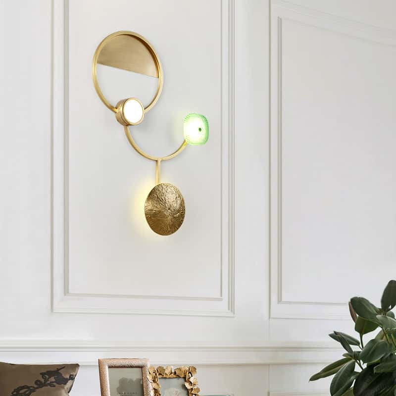 This luxury designer wall lamp blends modern geometric artistry with premium craftsmanship, creating a stunning centerpiece for any space. Featuring a sleek gold metal frame, a half-circle brushed metal plate, a textured gold disc, and a green honeycomb-pattern glass shade, it provides both ambient LED lighting and stylish decoration. The unique combination of circles, textures, and colors makes it perfect for enhancing living rooms, bedrooms, hotels, restaurants, and galleries. A true statement piece for buyers seeking elegant, high-end lighting solutions.