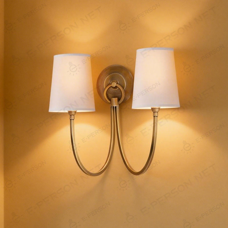 This classic double wall lamp features a refined brass finish metal body combined with two fabric lampshades, delivering warm and balanced illumination.The symmetrical curved arms create an elegant silhouette, making it ideal for both decorative and functional wall lighting.