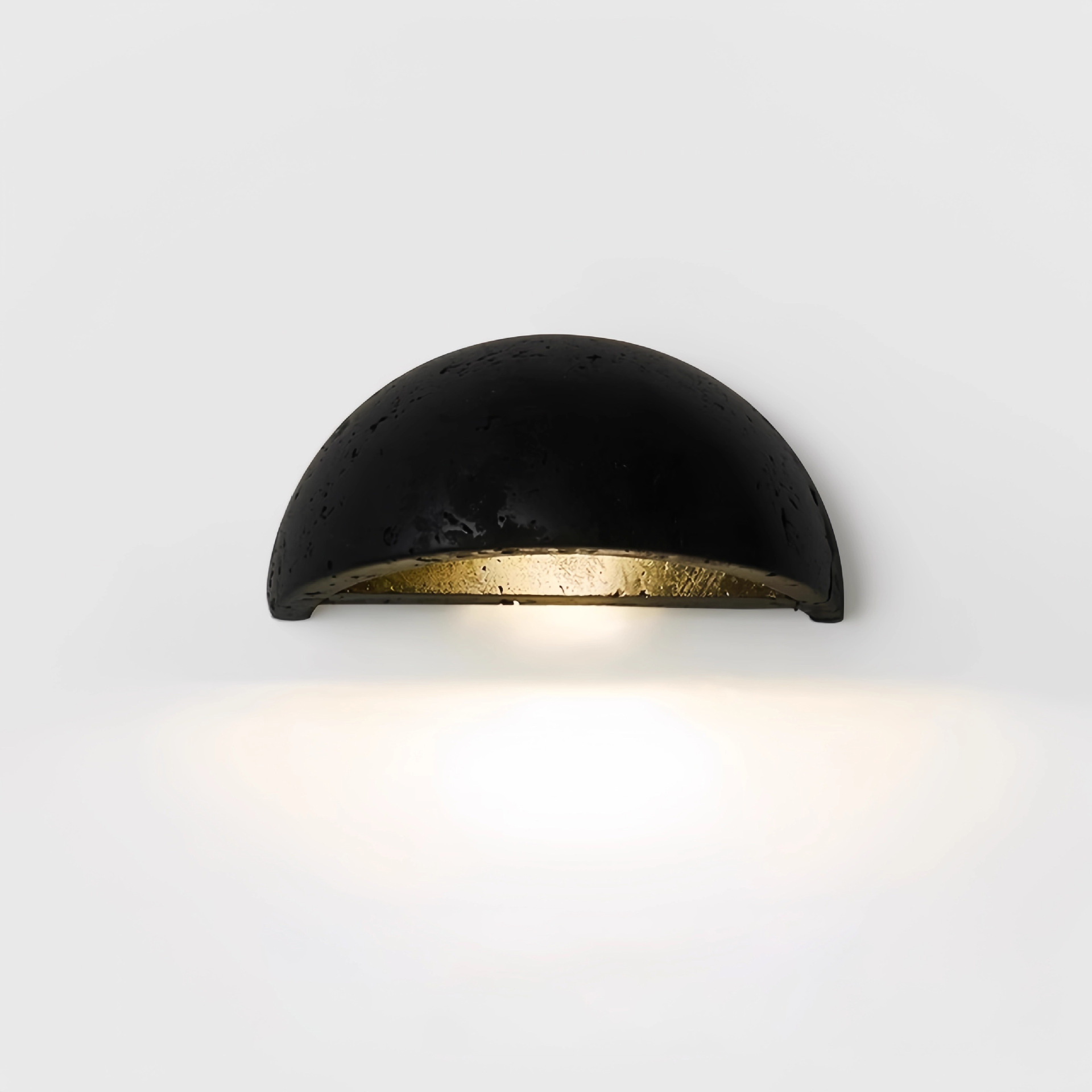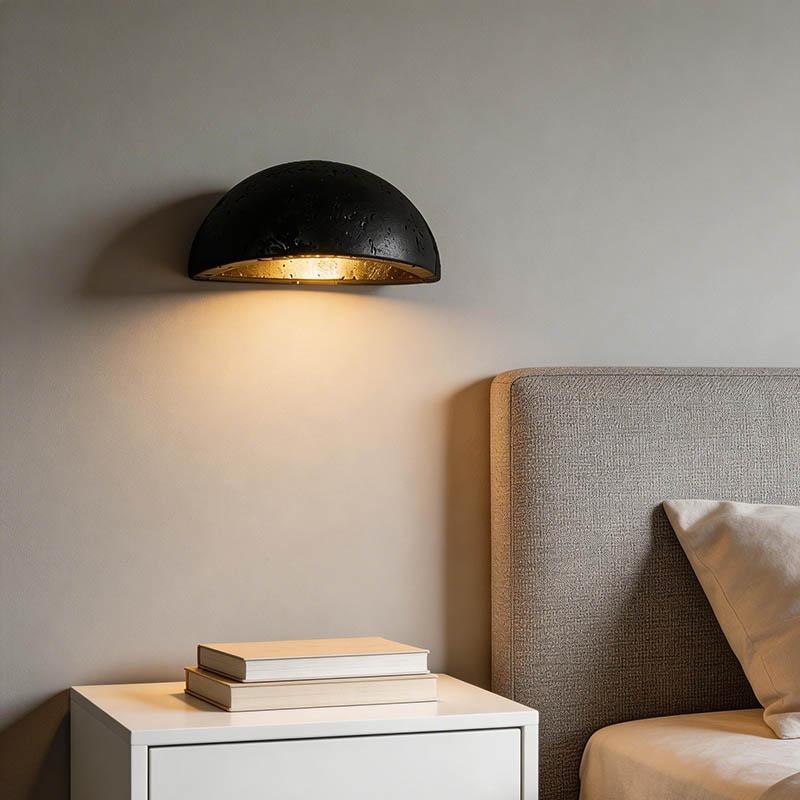 This modern half-dome wall lamp features a sleek matte black exterior combined with a warm gold inner finish, creating a soft and luxurious lighting effect. The semi-circular design delivers both decorative appeal and functional illumination, making it ideal for bedrooms, living rooms, corridors, and hotel projects.