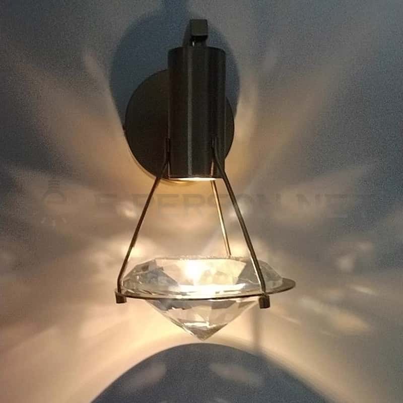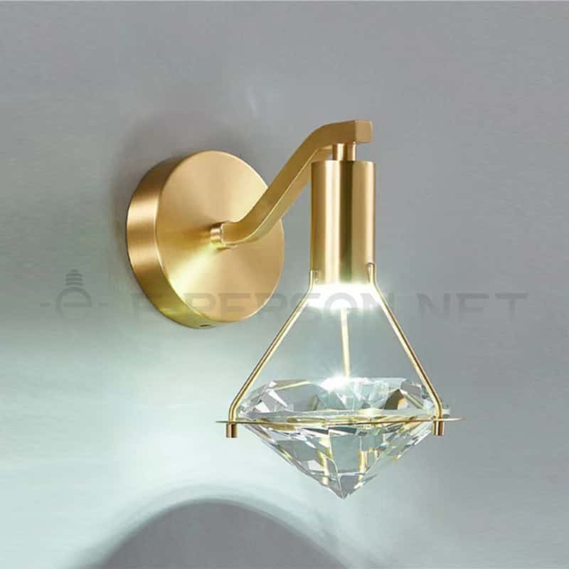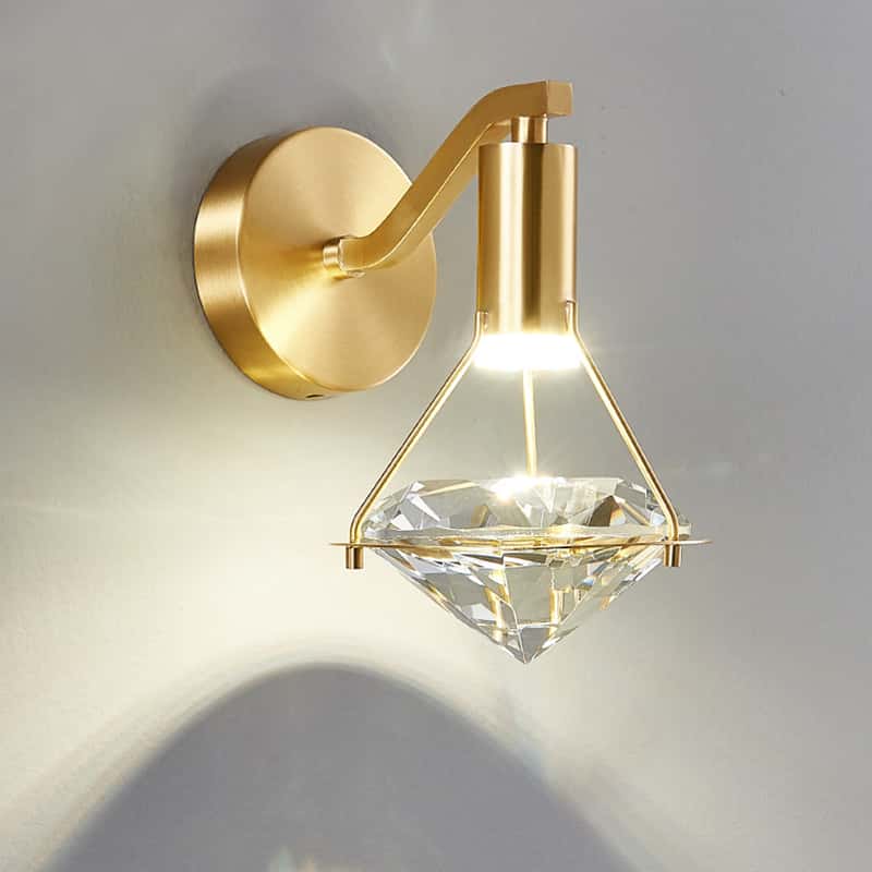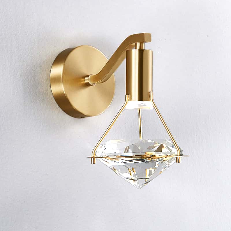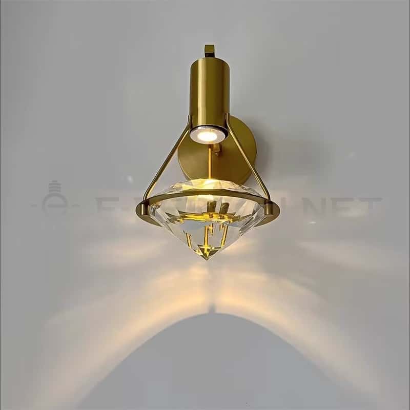 This modern luxury wall lamp features a geometric crystal shade combined with a brushed gold metal backplate, delivering a premium and elegant aesthetic for high-end interiors.