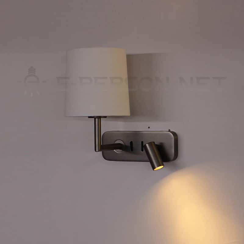 This modern wall lamp features a dual-light design consisting of a soft fabric shade for warm ambient illumination and a flexible LED spotlight for focused reading light. The brushed metal base adds durability and a refined look, while the cylindrical fabric shade diffuses light gently for a cozy atmosphere. The adjustable reading light allows you to direct the beam where needed without disturbing others.
