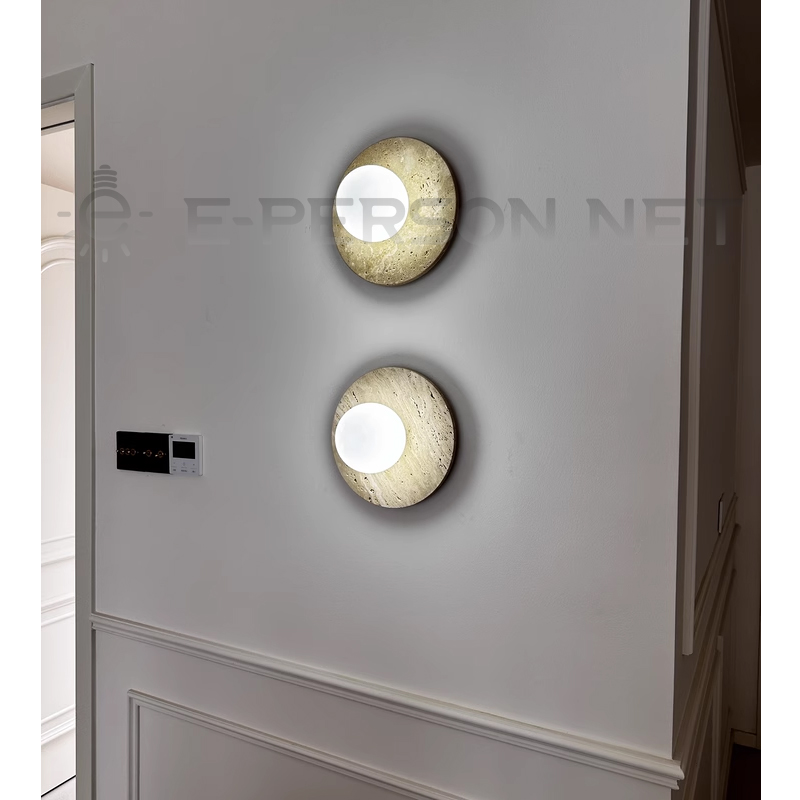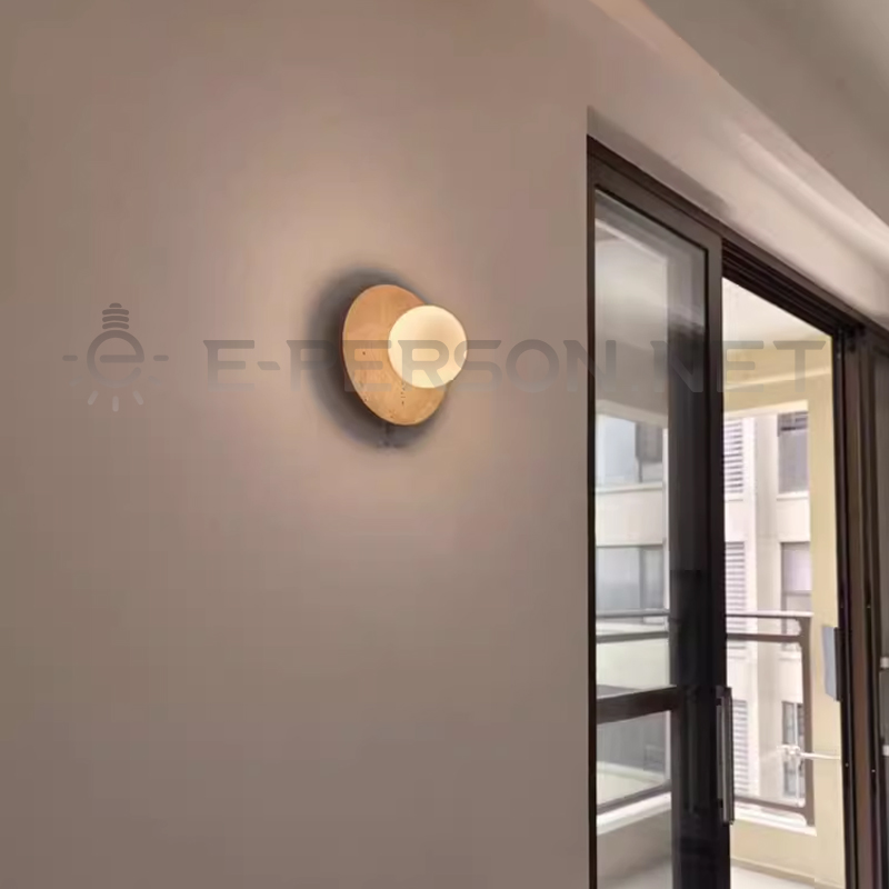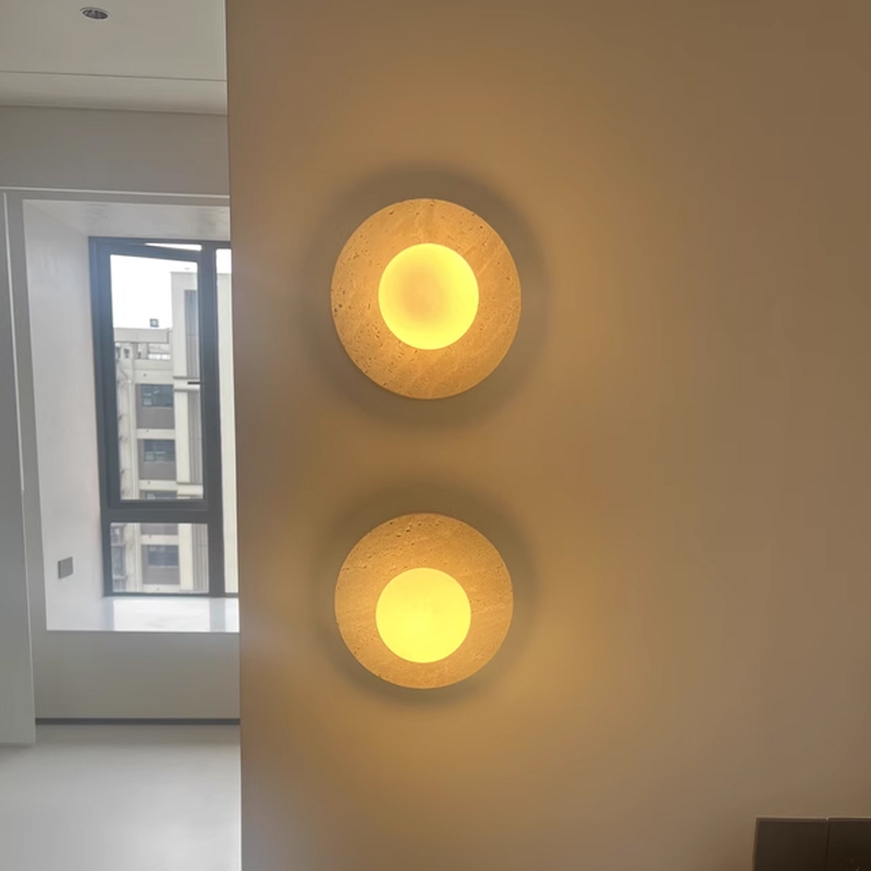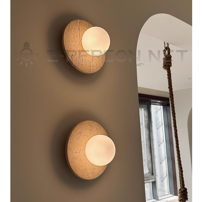 This Wabi-Sabi style round wall sconce blends natural materials with minimalism to create an understated statement piece. The clean circular stone-textured backplate paired with a frosted globe offers a warm, cozy glow — perfect for a bedroom, hallway, or modern natural-themed interior.