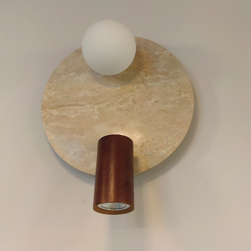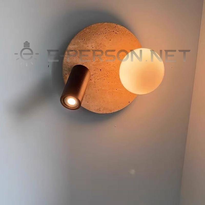 Wabi-Sabi Dual Light Wall Sconce | E14 Globe + Adjustable Spot Wall Lamp | Stone Texture Backplate with Wooden Accent